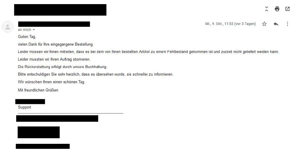 Kurz und knapp: Der Verkäufer hat mir gesagt dass es zu einem Fehlbestand kam und hat den Verkauf storniert.