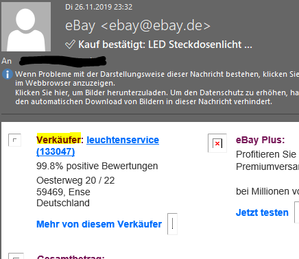 Ich erhalte bislang tatsächlich in jeder eMail zu Käufen auch die Adresse des Verkäufers mitgeteilt.