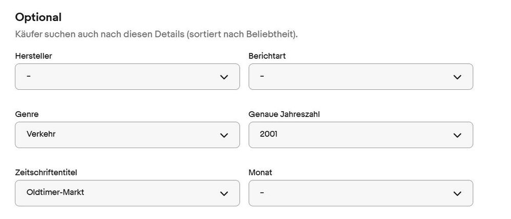 Danke für die Rückmeldung, @troedel_ernst! Ich habe mir das gemeinsam mit der Technik angesehen und möchte dir im ersten Schritt empfehlen, auf das Verkäufer Cockpit Pro zu wechseln. Dieses wird dir die Verwaltung deiner Zeitschriften einfacher machen und du kannst bei der Bearbeitung das erweiterte Einstellformular verwenden, welches dir die Handhabung ebenfalls erleichtern sollte. Das erweiterete Einstellformular zieht sich keine Artikelmerkmale automatisch aus dem Angebotstitel.