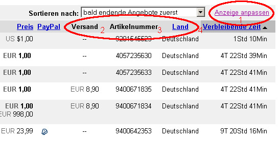 1. Unter "Anzeige anpassen" (1) können Sie jetzt auchdie folgenden Angaben in die Listen aufnehmen: