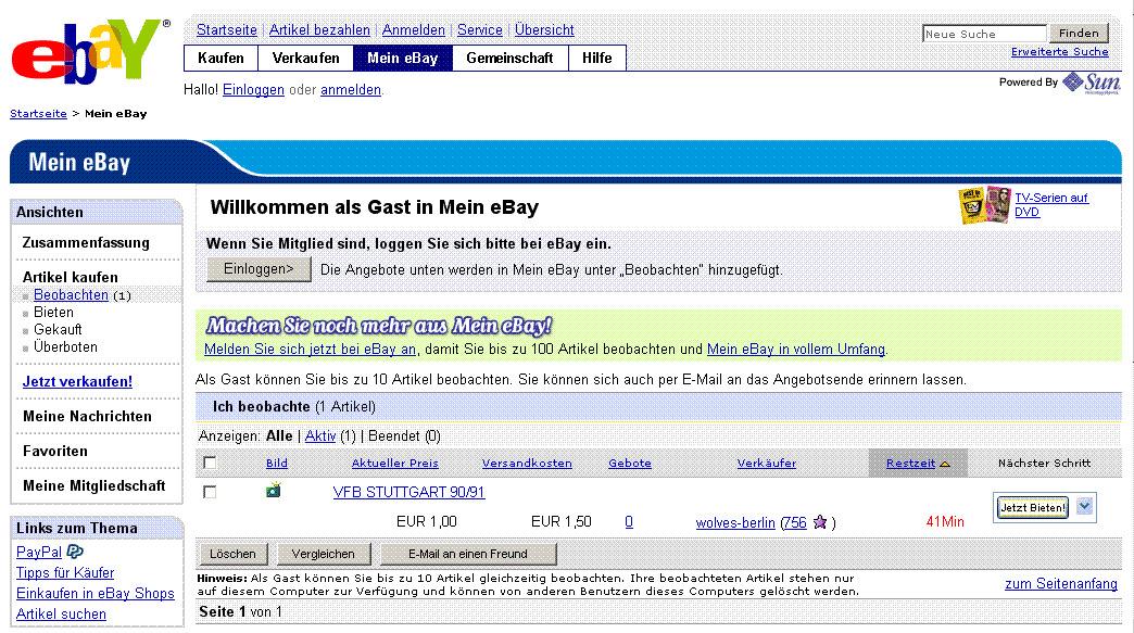 - Als Gast ist es nicht möglich zu bieten, zu kaufen, zuverkaufen oder andere Funktionen zu benutzen, die eine Anmeldungbei eBay voraussetzen.